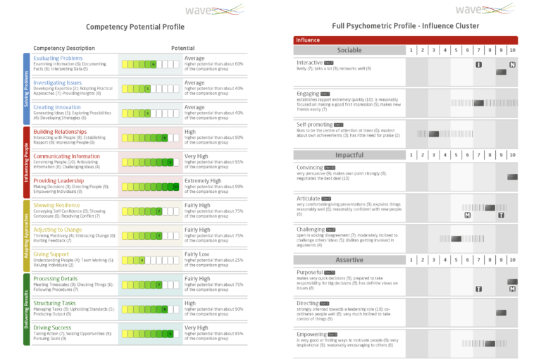 The Wave Questionnaire is the only tool that measures the relationship between Talents and Motives and enables the diagnosis of the Candidate’s ability to adapt to a position and organisational culture. The profile analysis shows divergences between Talents and Motives, revealing hidden areas and internal conflicts that may block personal development. The findings can be used in feedback or coaching sessions.